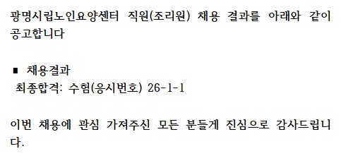 ±¤¸í½Ã¸³³ëÀοä¾ç¼¾ÅÍ Á÷¿ø(Á¶¸®¿ø) ä¿ë °á°ú °ø°í