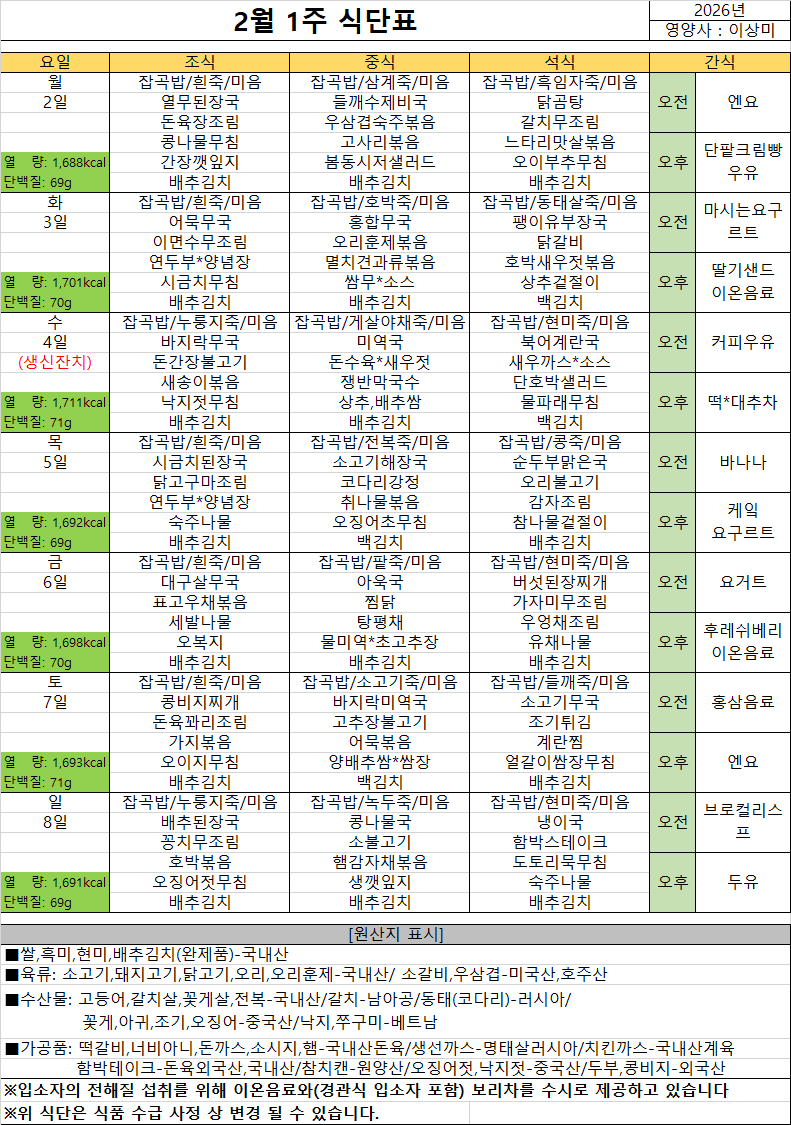 2026³â 1¿ù 2ÁÖ ½Ä´ÜÇ¥
