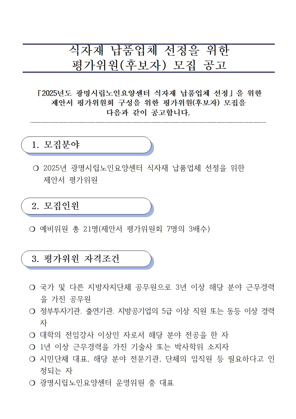 2025³â ±¤¸í½Ã¸³³ëÀοä¾ç¼¾ÅÍ ½ÄÀÚÀç ³³Ç°¾÷ü ¼±Á¤ Æò°¡À§¿ø(Èĺ¸ÀÚ) ¸ðÁý °ø°í