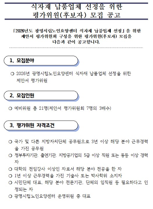 2026³â ½ÄÀÚÀç ³²Ç°¾÷ü ¼±Á¤À» À§ÇÑ Æò°¡À§¿ø(Èĺ¸ÀÚ) ¸ðÁý °ø°í