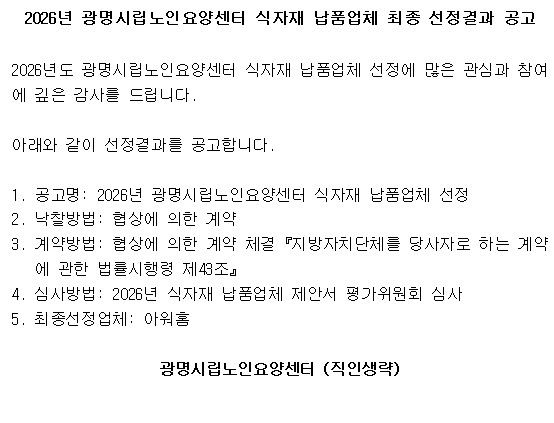 2026³â ±¤¸í½Ã¸³³ëÀοä¾ç¼¾ÅÍ ½ÄÀÚÀç ³³Ç°¾÷ü ÃÖÁ¾ ¼±Á¤°á°ú °ø°í