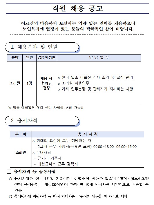 ±¤¸í½Ã¸³³ëÀοä¾ç¼¾ÅÍ Á÷¿ø(Á¶¸®¿ø) ä¿ë °ø°í
